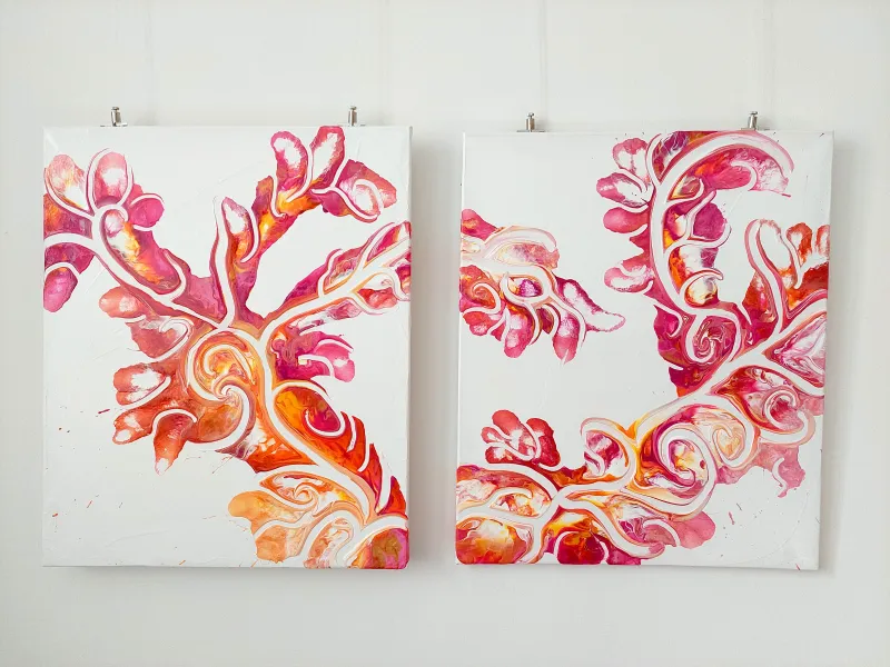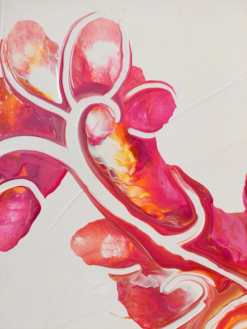 Candy Tree grows out of a network of sweeping lines in bright magenta, pink and rose tones. The shapes branch out like the branches of a tree or like soft coral, light, playful and full of movement. Leaf-like structures open up in all directions and lend the picture a lively dynamic.