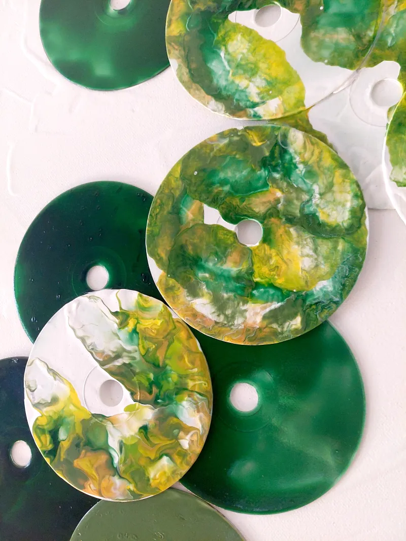 Saturated green, light yellow and dark green tones cover the surface in soft color gradients and encounter an object that once stood for progress: the CD. Embedded in color and structure, it loses its original function and gains a new meaning. Technology is not used here, but transformed.