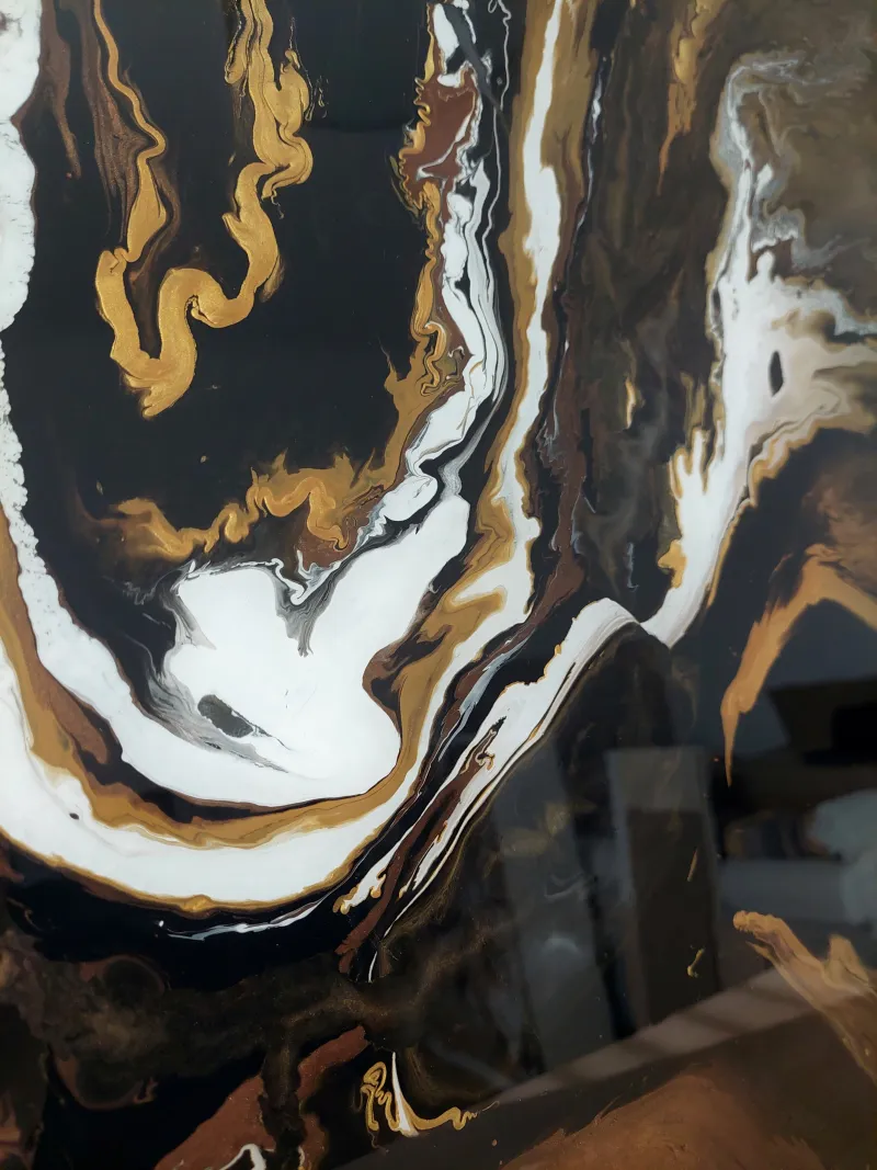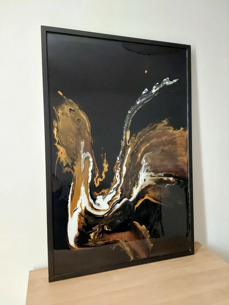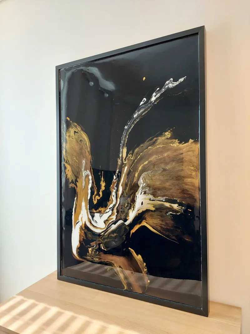 Realized on a reused picture frame and finished with epoxy resin, the work combines sustainable circular economy with timeless elegance and new shine in the material loop.