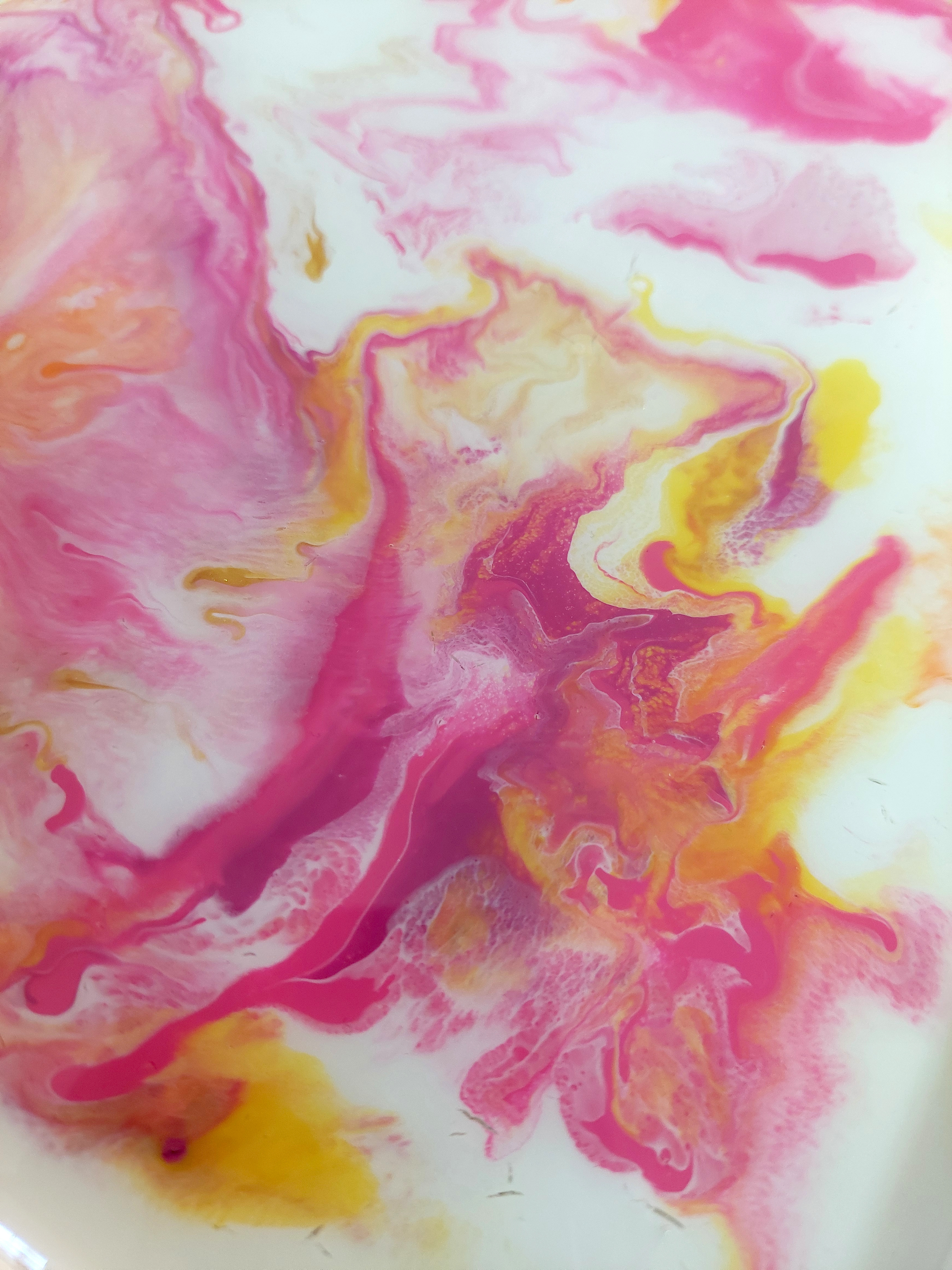 Achten Sie darauf, dass bemalte Flächen nicht in direkten Kontakt mit anderen Materialien (wie Papier oder Plastikverpackungen) kommen. Trotz Versiegelung könnten die Flächen verkleben und sich nur schwer – oder gar nicht – ohne Schäden voneinander lösen.